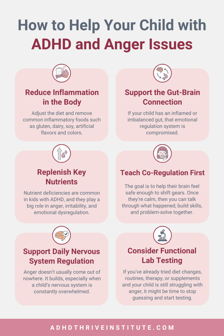 ADHD impacts the parts of the brain responsible for impulse control, emotional regulation, and executive function. When combined with things like inflammation, poor sleep, or nutrient deficiencies, anger can become more frequent and intense.