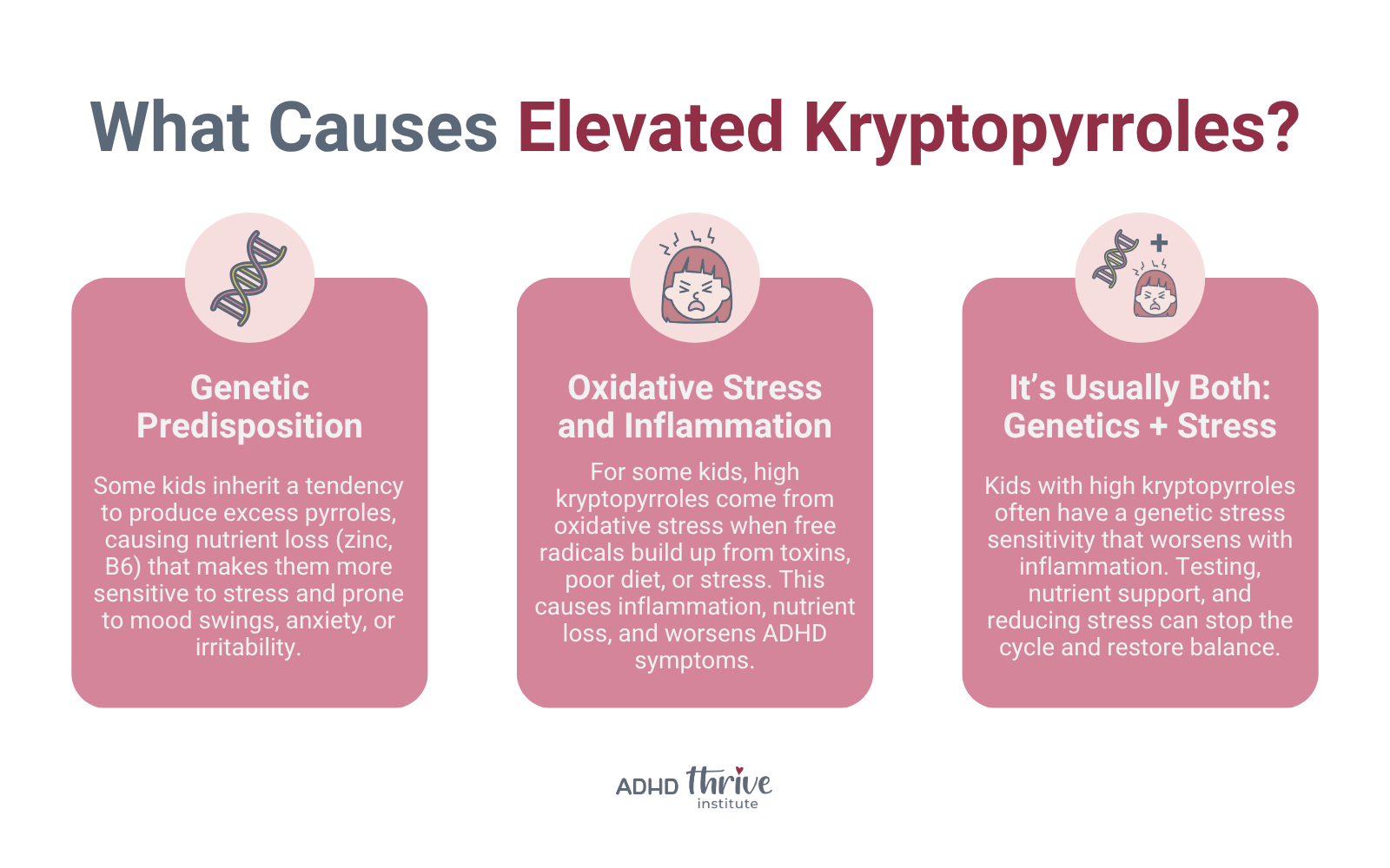 That inflammation can contribute to mood instability, poor sleep, trouble focusing, hyperactivity, or emotional dysregulation. In other words, oxidative stress and inflammation are known underlying stressors of common ADHD symptoms. When oxidative stress goes unchecked, it can increase kryptopyrrole production, leading to nutrient loss and an even deeper cycle of dysregulation.